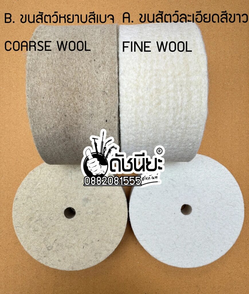 ล้อขัดเงาขนแกะแท้ 100% ของบริษัทผลิตจากขนสัตว์ธรรมชาติแท้เต็มเนื้อ ไม่มีเส้นใยสังเคราะห์เจือปน และผ่านกระบวนการผลิตที่พิถีพิถัน โดยขนแกะที่นำมาใช้ถูกแบ่งออกเป็นสองประเภทหลัก คือ ขนแกะละเอียด (Fine Wool) และขนแกะหยาบ (Coarse Wool) ซึ่งแม้จะเป็นขนแกะแท้ 100% เหมือนกัน แต่มีความแตกต่างอย่างชัดเจนในเรื่องของคุณภาพ ความสะอาด และกระบวนการแปรรูป ขนแกะละเอียดต้องผ่านมากกว่า 10 ขั้นตอนเพื่อคัดแยกสิ่งเจือปนและขจัดความหยาบออกไปจนได้เส้นใยขาวสะอาด มีเนื้อแน่นนุ่มละเอียด เหมาะอย่างยิ่งสำหรับงานที่ต้องการความประณีตสูง ไม่ทิ้งรอยขีดข่วนเล็ก ๆ มีความทนทานและสามารถใช้งานได้ยาวนานโดยไม่ต้องกังวลเรื่องการหลุดร่อนของขน เนื่องจากไม่มีการใช้กาวผสมในเนื้อขนแกะแต่อย่างใด